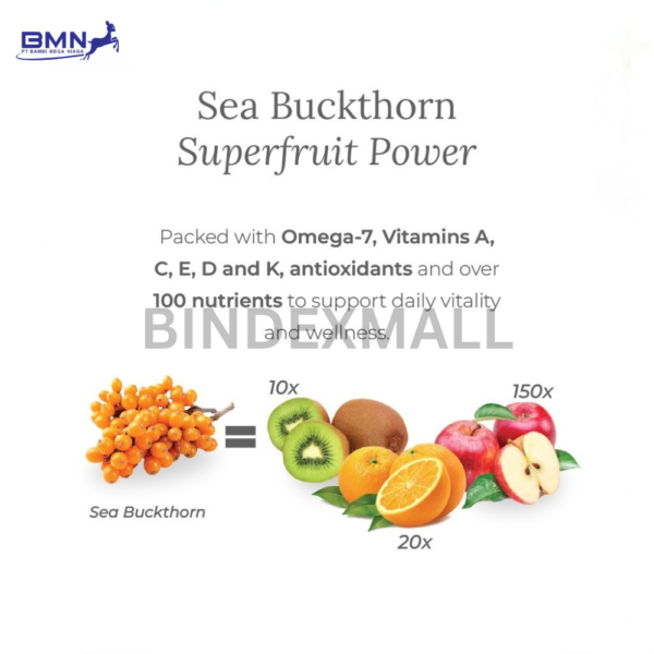 Produk ini menggunakan minyak sea buckthorn hasil cold-pressed untuk menjaga kemurnian dan kualitas nutrisinya. Formula non-GMO tanpa pengawet membuatnya aman dikonsumsi setiap hari. Selain itu, kapsulnya didesain agar tubuh menyerap nutrisi lebih optimal sehingga manfaatnya terasa lebih cepat dan maksimal.