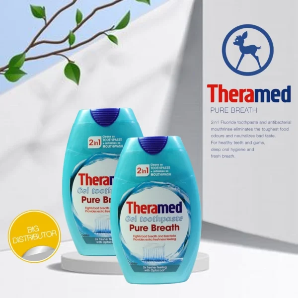 Theramed memiliki teknologi yang membuat sensasi bersih dan segar bertahan hingga 3 kali lebih lama. Pasta gigi gelnya bekerja membersihkan gigi secara mendalam sambil menghambat pembentukan plak. Sementara itu, fungsi mouthrinse antibakteri membantu menetralkan kuman penyebab masalah mulut.